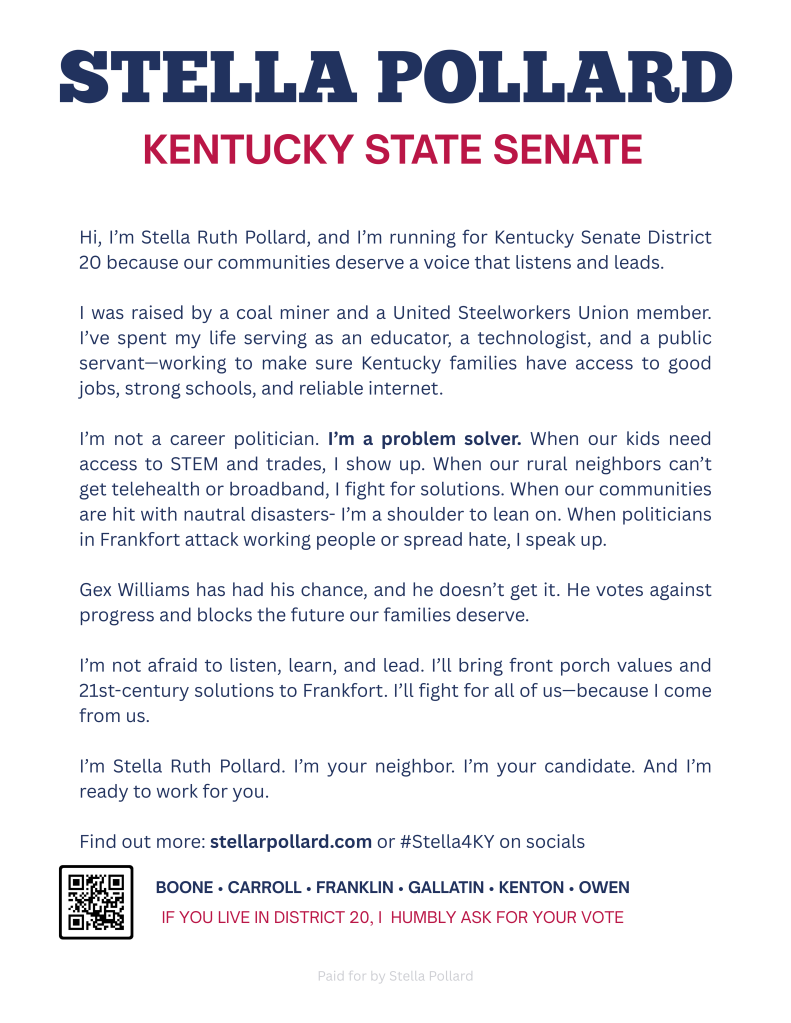 “Stella Pollard’s advocacy echoes the spirit of Kentucky, resilient and committed to a future where every individual has an opporunity to thrive.” – Cluster Howard, former State Representative District 91